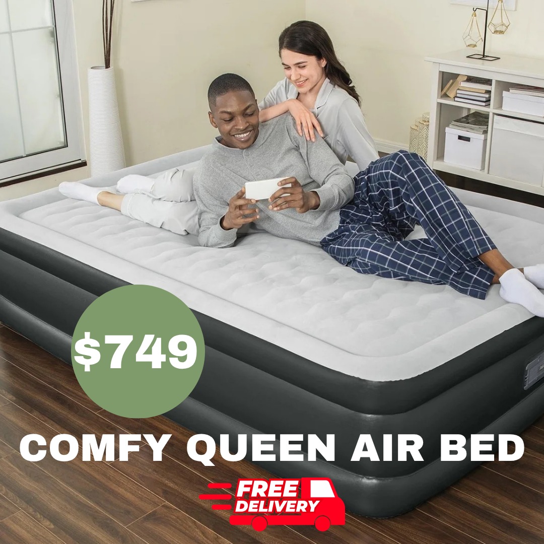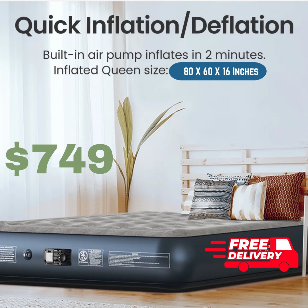 Durable queen-sized pillow rest raised air mattress with built-in quickfill pump. Inflates in less than 3 minutes.